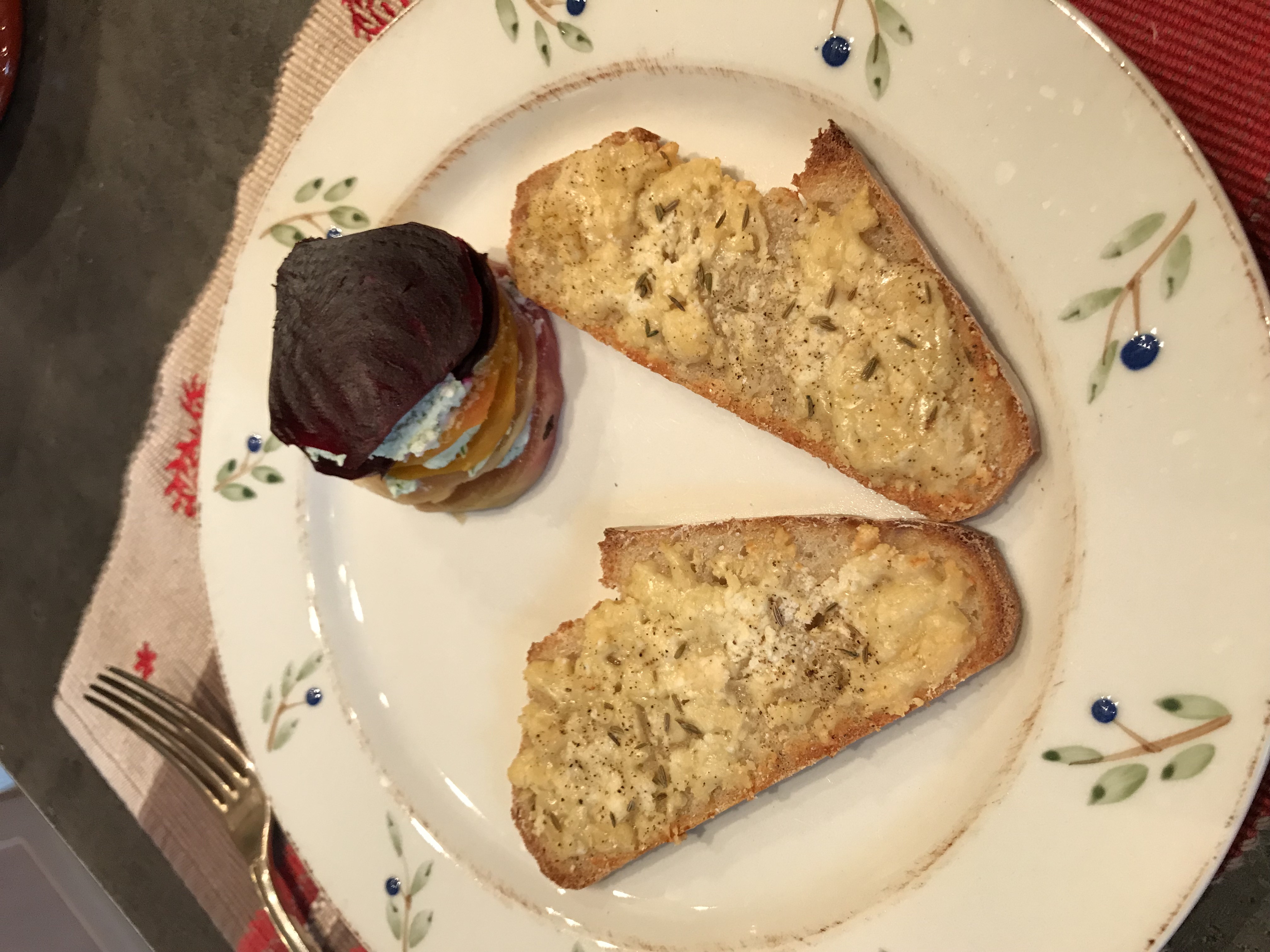 Tartine: tartiner le pain de boulette et parsemer les graines de cumin faire griller au four betteraves: détailler en tranches 2-3mm épaisseur une betterave cuite au four. tartiner les tranches de fromage de chêvre à l'ail des ours et monter en mille feuilles. dresser sur les assiettes, décorer avec des herbes fraîches ou des graines germées.