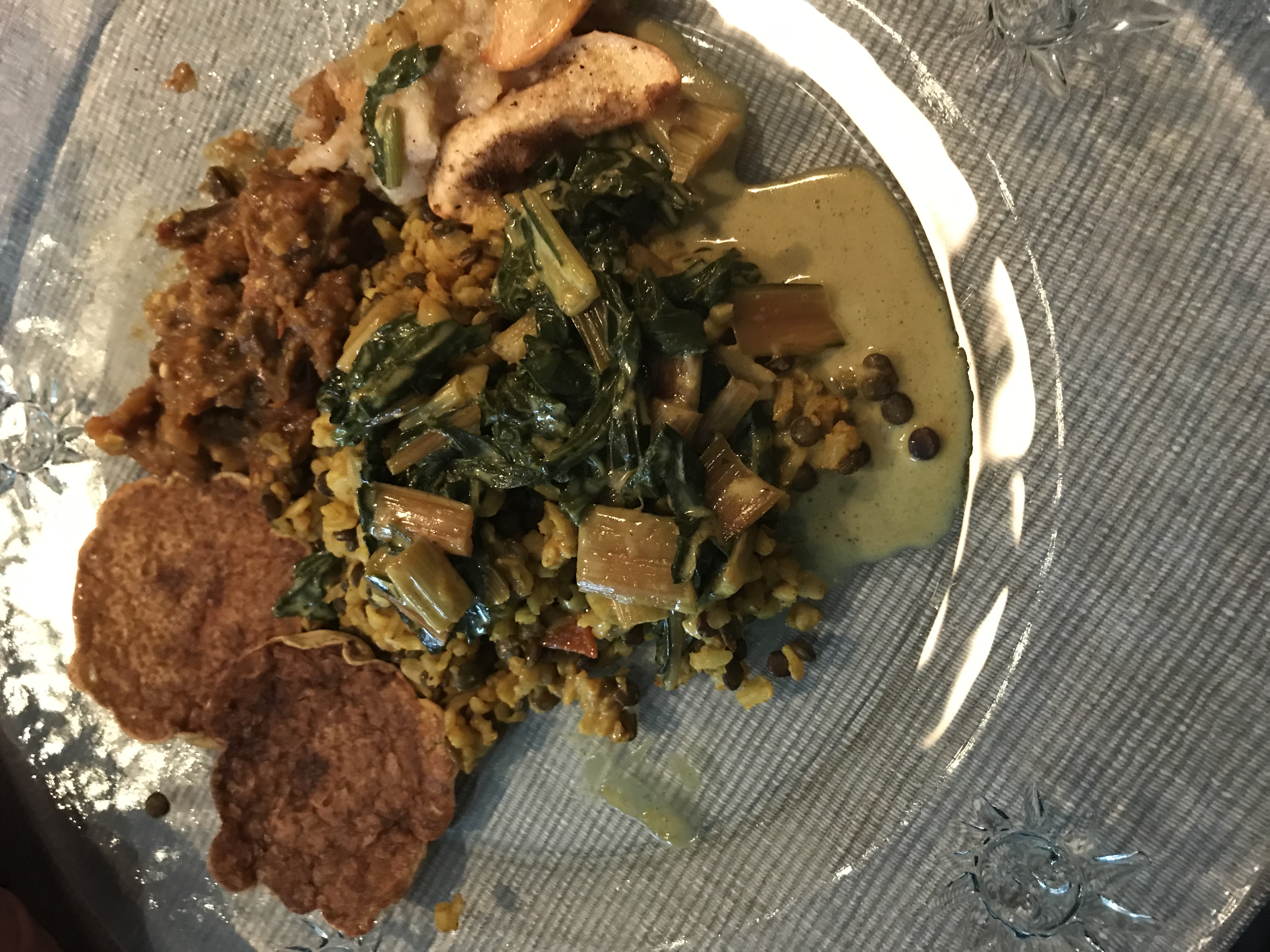 faire la recette de la purée d'aubergine à l'indienne Prévoir 4 crêpes de pois chiches par personne Faire cuire 100g de riz basmati complet et 100g de lentilles et les rassembler à la fin de la cuisson. Les faire sauter au beurre avec des épices indiennes pour riz Faire cuite des blettes de couleur, tiges et feuilles. Bien égoutter, faire secher à la poele et ajouter du curry et de la crème fraîche Faire cuire des quartiers de pomme au four avec de la canelle et du garam masala dresser assiette: au centre riz+lentilles avec blettes au curry par-dessus à gauche la purée d'aubergine avec les crêpes de pois chiches à droite les quartiers de pomme